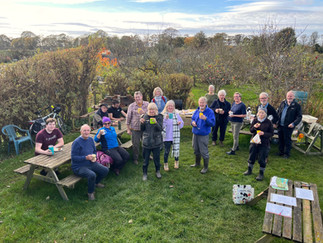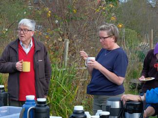 Thanks to all of the 40 people who assisted at the working party on Sunday. Everybody who took part applied themselves vigorously to their tasks and much was achieved. Chris and Andy with help from Gavin put in two new fence posts at the North East corner and partially repaired the broken down hut next to the toilet block . This is now waterproof but will not last much longer; it needs a new door. A good deal of work was done on the paths and on pruning shrubs and brambles on the site. The hut next to the toilet block and the toilet were painted by Joan, Meryl, Tim and Jo and others. Special mention should be made to Irene Brown for extremely intensive strimming. As usual, Chris was a ball of fire and stepped in at the last minute with Meryl to provide soup, drinks and food for the workers. Thank you also to all those who brought additional items of food. We were not able to have a fire because of City regulations but we will have one next Sunday.